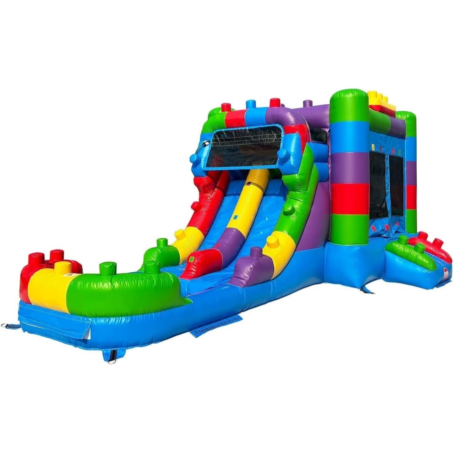 The Lego Combo is a premium bounce house that delivers colorful, active play. This Lego-themed inflatable features a large bounce floor, climbing entrance and slide. It can be used wet or dry, making it ideal for summer splash parties or indoor play days. Vibrant colors attract kids and make photos pop. Durable construction and safety netting keep play safe and worry-free.